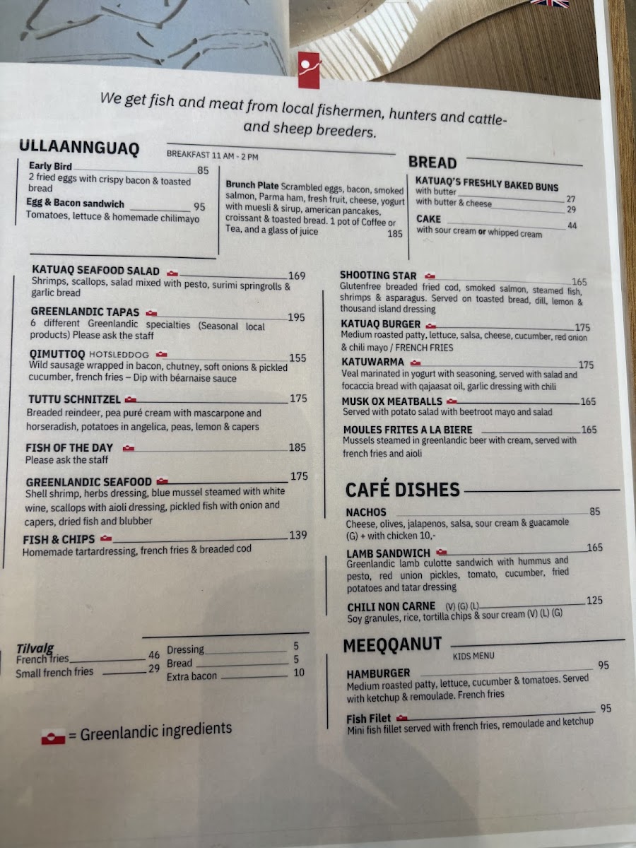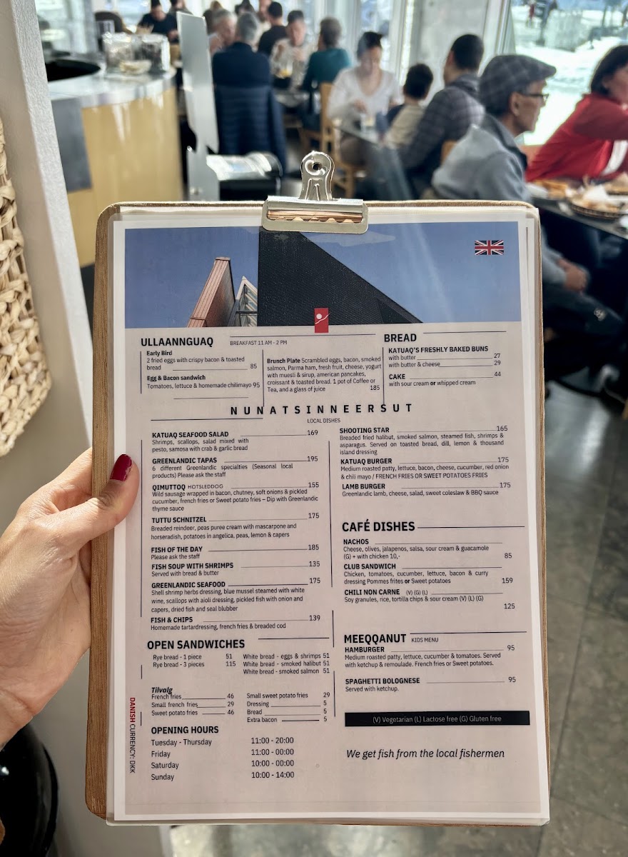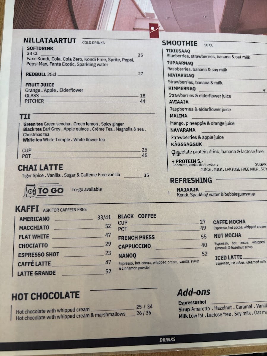 Cafétuaq also boasts hearty offerings like the Hot Sled Dog, a culinary conversation starter with its unique ingredients. With ample seating and pillows for comfort, it serves as an inviting spot for both locals and tourists. Patrons can enjoy quality coffee alongside generous portions of food, making it an ideal place to relax and watch life go by. Overall, Cafétuaq captures the essence of Nuuk, serving dishes that resonate warmth and community.